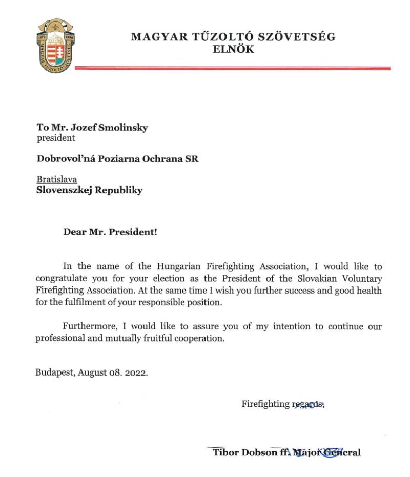 A Szlovák Tűzoltó Szövetség új elnöke Jozef Smolinský, akinek Dobson Tibor tű. vőrgy., a Magyar Tűzoltó Szövetség elnöke 2022. aug. 5-6-án, a Szlovákiában megrendezett ünnepségen személyesen is gratulált.