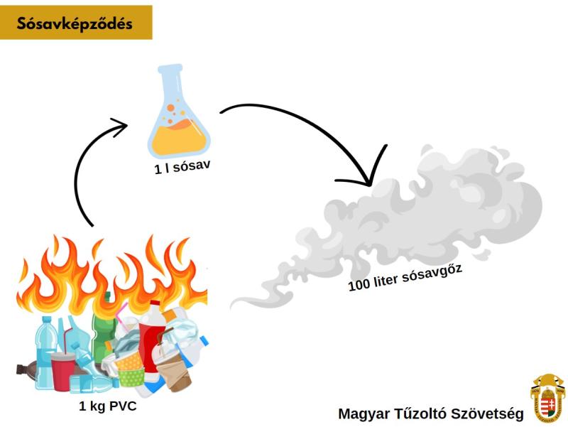 Az épületeinkben csövek, padló, kábelszigetelés, alkatrészek formájában nagy mennyiségben fordul elő PVC. Égéséből (klórtartalma miatt) hidrogén-klorid, dioxin és egyéb környezetkárosító vegyületek keletkeznek. Korrozív hatása miatt a hidrogén-klorid az egyik közellenség, azaz a sósav. 1 kg PVC égéséből 1 liter sósav keletkezik, amelyből a tűzben 100 liter sósavgőz képződik és minden elektromos berendezésen, finomechanikai és számítástechnikai termékben komoly károkat okozhat.
