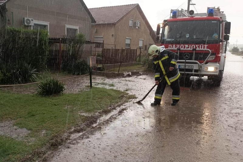 A nagy mennyiségben lehullott csapadék miatt tizenöt esetben kérték a tűzoltók segítségét az udvarokba, épületekbe, pincékbe és aknákba befolyó esővíz miatt Tiszakécskén. Az önkormányzati, az önkéntes és a hivatásos tűzoltók egyik helyről a másikra vonulva folyamatosan szivattyúzták a vizet. (fotó: Lakitelek ÖTE)
