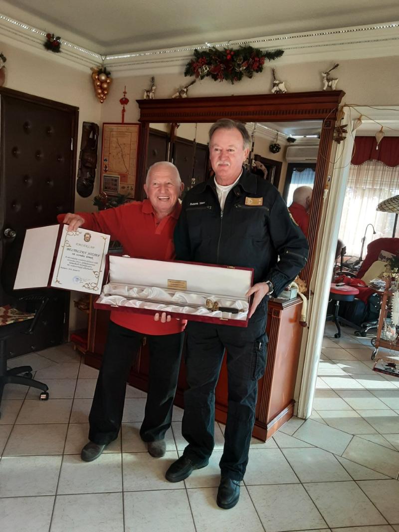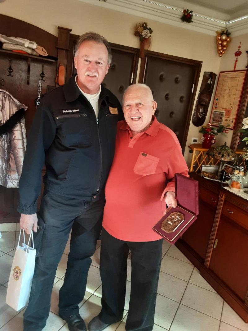 Dobson Tibor ny. tű. vőrgy., a Magyar Tűzoltó Szövetség elnöke az ezredes úrnak a 90. születésnapja alkalmából emléktárgyat adományozott.