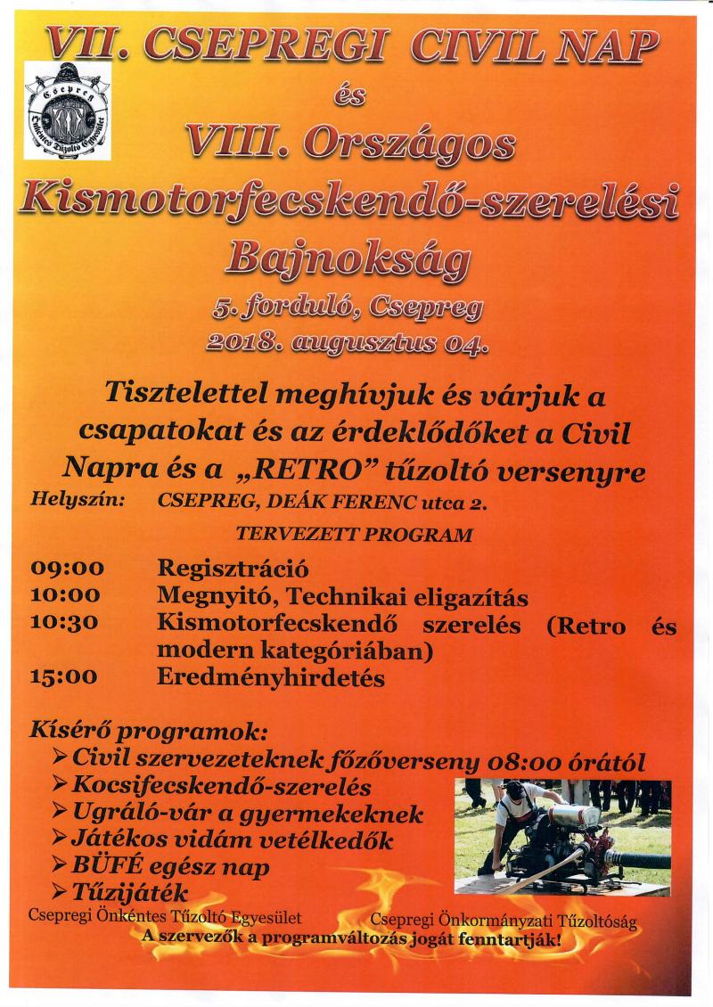 A rendezvénnyel párhuzamosan kerül megrendezésre a VII. Csepregi Civil Nap, ahol főzőversennyel, kocsifecskendő szereléssel, gyermekeknek ugrálóvár biztosításával, vidám műsorokkal, vetélkedőkkel, este tűzijátékkal kedveskedünk a helyi civil szervezeteknek. Szálláslehetőséget biztosítani nem tudunk, azonban a településen kemping lehetőség (Ottó-Kemping) illetve Bük városban ( 5 km távolság) apartmanok, kempingek rendelkezésre állnak.